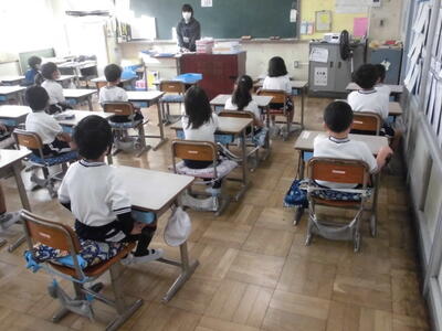 ( ↓ 先に集まった児童は、先にすわって皆がそろうのを待ちます。担任の先生がクラスの点呼をとります。)