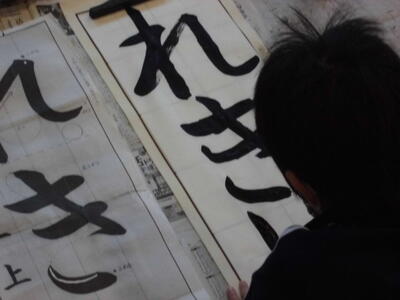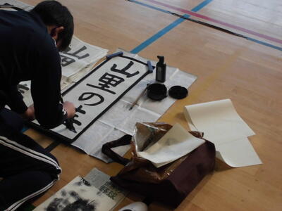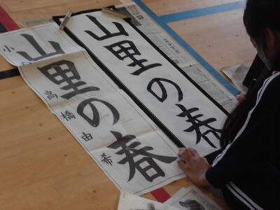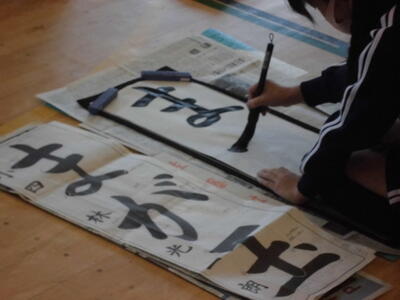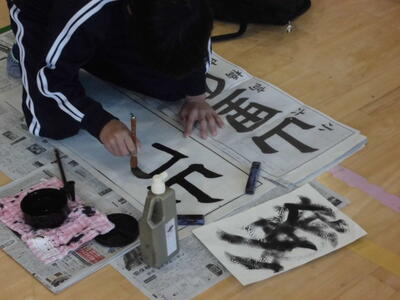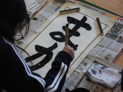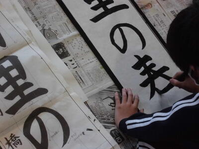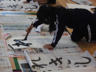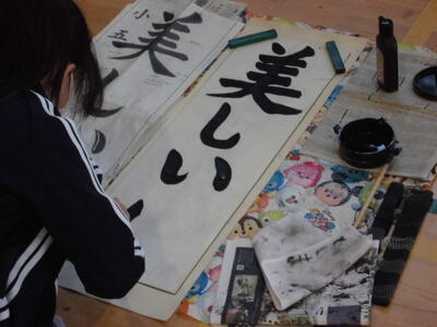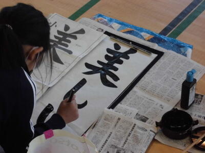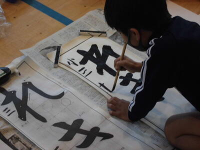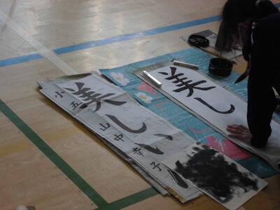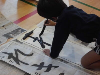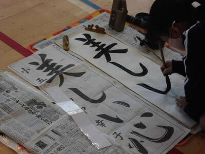 ↓ 校内書きぞめ展で多くの児童が金賞で表彰されました。代表して6年生児童が賞状を受け取りました。