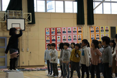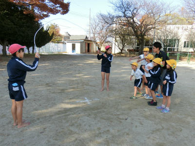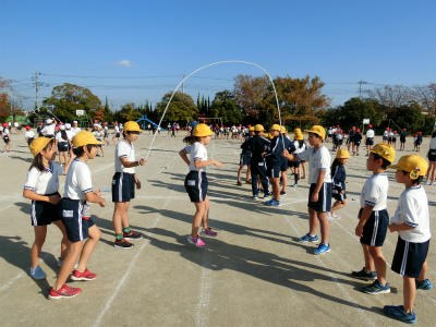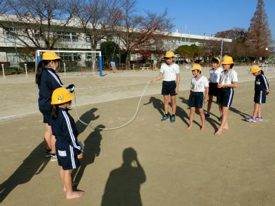 いつもどおり、縦割りのそれぞれの班に分かれて活動しました。今回は「長縄跳び」。上級生の先輩たちが、1年生に「8の字跳び」を教えてくれました。1年生も飲み込みが早く、上手に跳んでいました。