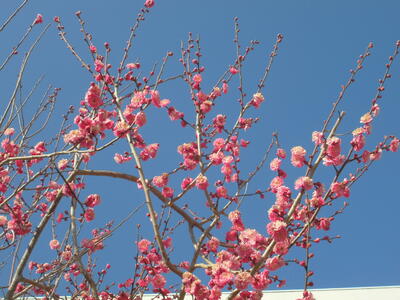 学校では、梅の花がきれいに咲いて、晴れた日は、赤い花が青い空に映えています。よい香りもただよっています。(下は先日の金曜日の写真です)