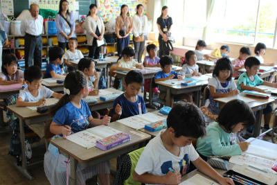 今日はその会合が行われるとともに、小渕の子どもたちの様子を御覧いただきました。たくさんの人たちが各教室に訪れたので、子どもたちも少しビックリしたようですが、それでも元気に授業で頑張る姿を見ていただきました。