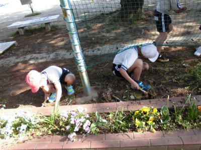 栽培委員会のみなさんは、花壇の草取りや花の苗植えをがんばってくれました。