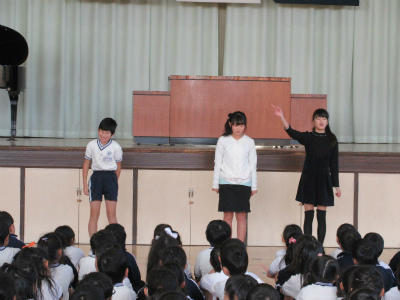 今日の児童朝会は、保健委員さんが「感染症を予防」について、発表しました。