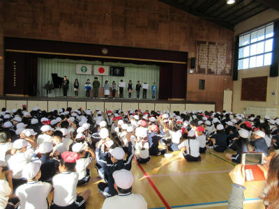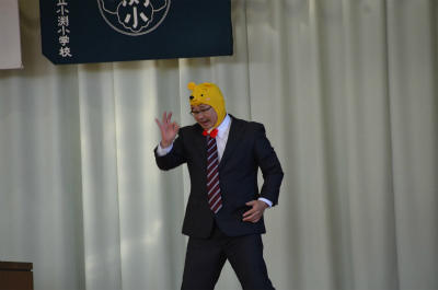 児童朝会の後、今日で小渕小を去られることになった瀬高先生を小渕小のみんなで送りました。