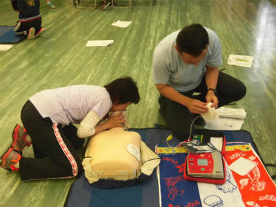 緊急時の連絡体制、AEDの使用、人工呼吸、心臓マッサージ等について、ダミーを使いながら研修を行いました。