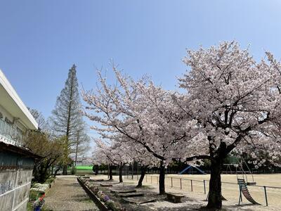 ( ↓ 午後になって、校庭の桜がますます咲いてきました。)