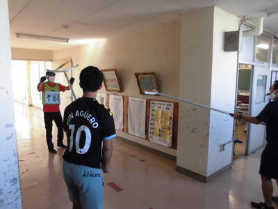 あいにく午後からは雨となってしまいました。予定していた運動会準備もじゅうぶんできませんでしたが、それでもPTA役員さんや、おやじの会の方のご協力で、校庭の準備(テント設営、くい打ちやロープ張り、遊具の結索など)が進みました。