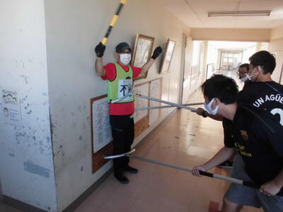 ( ↓ 校長先生が敷地内で伐採した枝や木を片付けています。学校応援のボランティアの方にも、ご協力いただきました。)