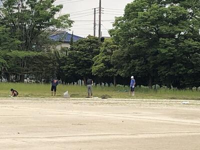 今日の学校では、公務員さんが雑草を刈ったり、鉄棒の補助台を直してくれたりしています。