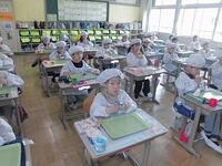 学校栄養士の先生に、グリンピースの話を聞き、2年生がさやむきをしました。