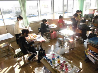 ↓ 2年生の図工、『ピコリン星の夢のステージ』の単元です。各自が持ち寄った材料(色紙やシール、透明容器など)で思い思いのステージを作り上げています。