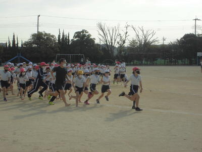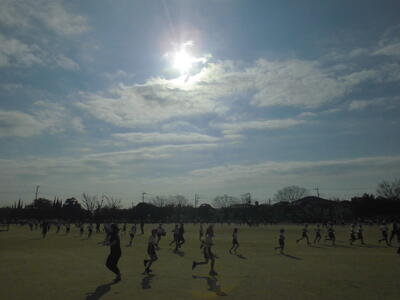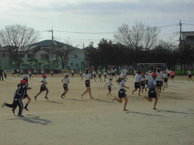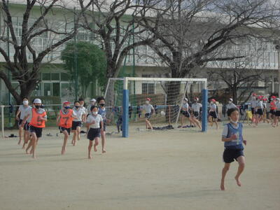 ( 6年生の最後の走りがスタートしました。6年間、駆けてきた校庭も、これで走り納めです。)
