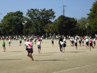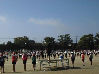今日の朝はさわやかタイム。全校児童が校庭で運動をします。