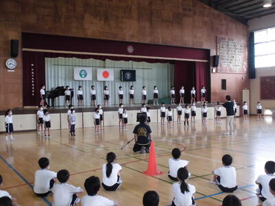 ( ↓ 体育館には、2・3・5年生が集まりました。)