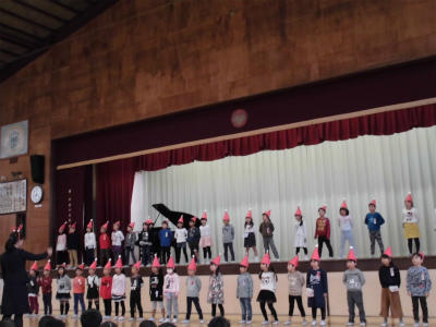 今月の歌が「We wish you a merry Christmas」、1年生の歌が「あわてんぼうのサンタクロース」、そして3年生が「歓喜の歌」と、12月らしい楽しい歌声が響きました。