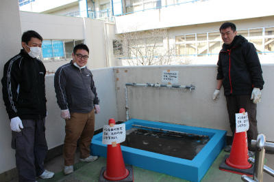 前回、縄跳び用ジャンピングボードを新調していただきましたが、今回は、壊れて使用できなくなった古いボードの廃材を上手に利用して制作していただきました。また、2階の足洗い場もペンキできれいに塗装してくださいました。 手際よいチームプレーは、さすがです。