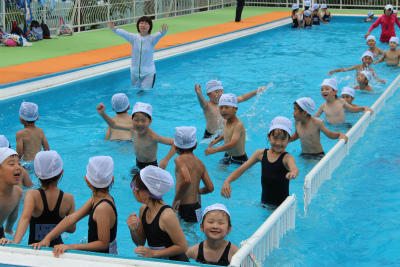 まだちょっと涼しい感じもありましたが、気温・水温も何とか規定に達し、実施することができました。1年生も初めてのプールでの授業です。にぎやかな声が響いていました。