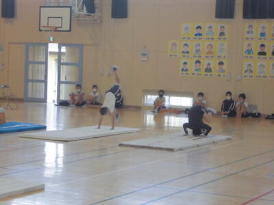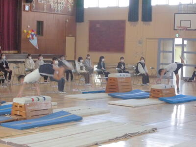 ( 続いて運動の発表です。マットや跳び箱の技を披露します。)
