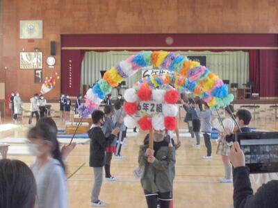 ( ↓ 5年生が、きれいなアーチで6年生を迎えます。)