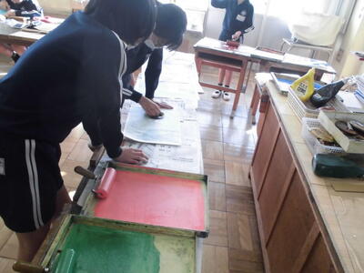 図工で、掘り進み版画をおこなっています。版画を彫っては色をつけて印刷し、また掘って違う色を重ねて多色刷りの版画を作っていきます。