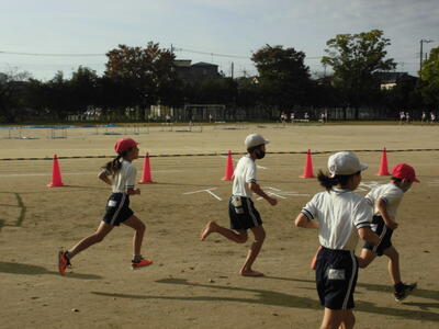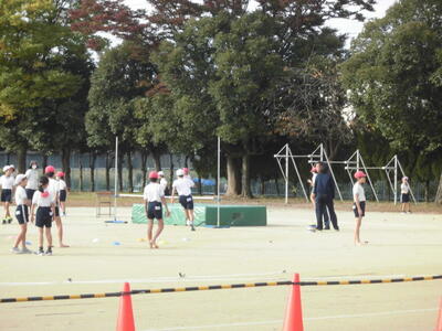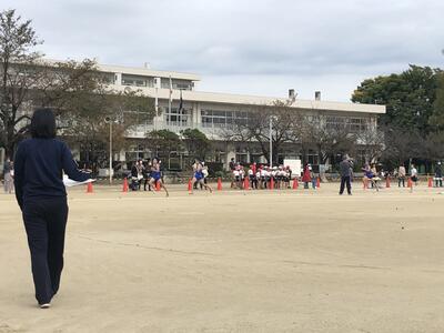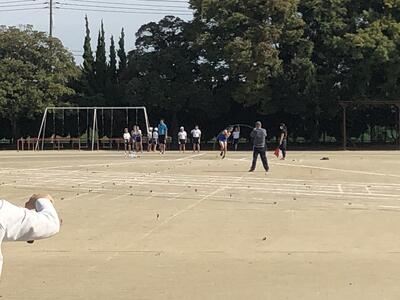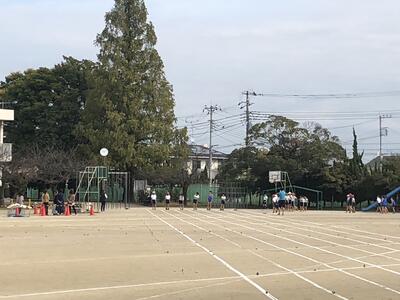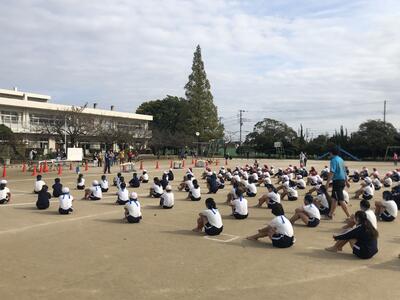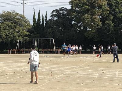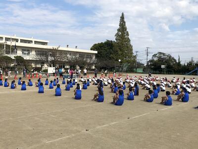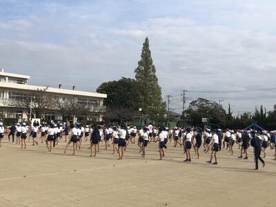 7:50 毎朝の一運動(いちうんどう)が始まっています。陸上大会は4年生以上ですが、1~3年生も朝の運動は元気に参加しています。