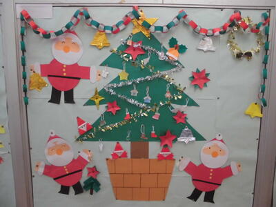 ( ↓ この時期をイメージした学校の掲示物。たんぽぽ・ひまわり学級の廊下にデザインされた壁面。)