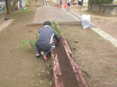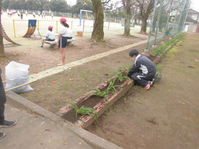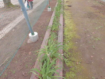 また、昨日(金曜日)は、校長先生が、校庭前の花壇に新しい花を植えました。まだ花はありませんが、春になって黄色いきれいな花が咲くのが楽しみです。
