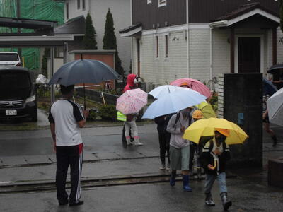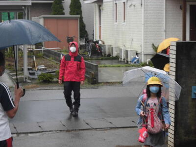 朝は、台風の影響の心配されましたが、子供たちはカサをさして登校しました。正門、昇降口、各教室で先生たちが登校した子供たちを迎えています。
