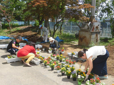 今日は、ボランティアの保護者の方々にプランターの苗植えをしていただきました。
