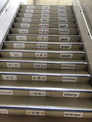 児童棟の校舎の階段です。、動物や植物の名が、ひらがな・漢字や英語を並べて書いてあります。階段を昇りながら、言葉に興味を持ったり、漢字や英語を学んだりすることができます。(上の写真は、動物の名前です。)