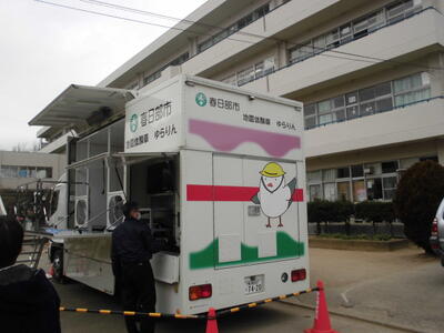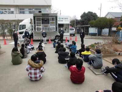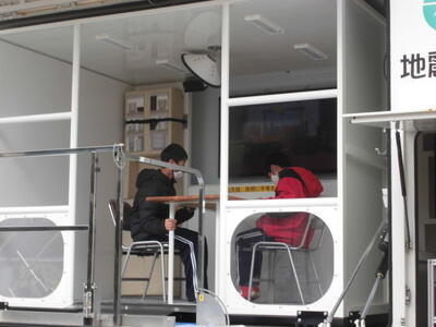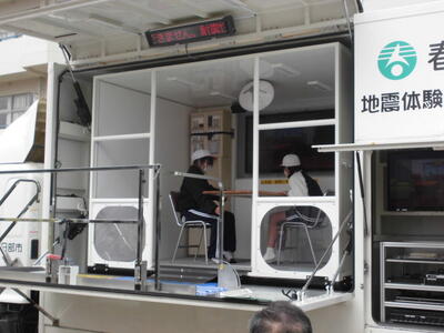 本日、春日部市の起震車が来校し、震度6などの地震の揺れを体験しました。(感染症予防のため、起震車には少人数で、また乗車前後にはアルコール消毒をおこなうなど、対策を徹底して実施しました。)