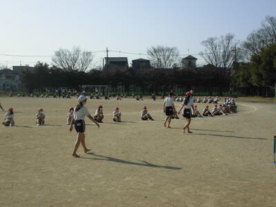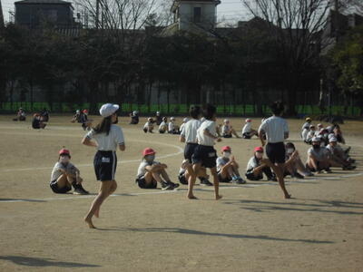 ( ↓ 下級生が見守る中、5分間を走りきりました。6年生は呼吸を整えています。いよいよ、この後は下級生のスタートです。)