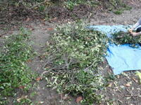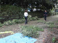 ( ↓ 校長先生が敷地内で伐採した枝や木を片付けています。学校応援のボランティアの方にも、ご協力いただきました。)