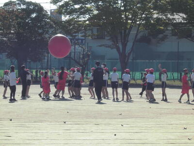( ↓ 全員で「大玉送り」。本番は二勝先取で決着ですが、今日は一回勝負のみです。)