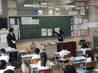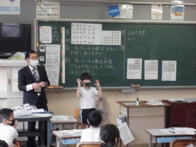 ( ↑ 2年生の算数の時間。子供たちが、お菓子の数をかけ算を使いながら、それぞれが工夫して答を出しました。自分のおこなった計算の方法をみなに説明しています。)
