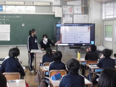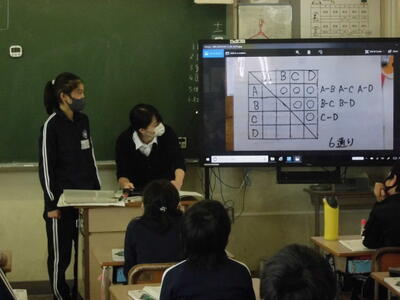 ( ↑ 6年生の算数。順列や組み合わせについて、チームの総当たりの試合数で数えてみました。どんな図や表を使って、どう考えたかを、図や表をモニターに映しながら説明しています。)