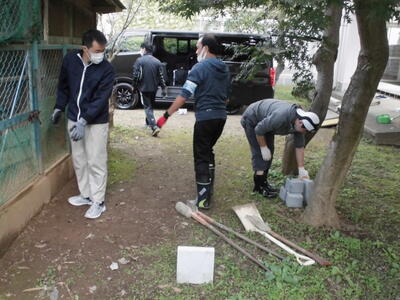 本日、おやじの会の活動がありました。学校のウサギ小屋が、ウサギたちによって穴が掘られたり柱がかじられたりして、傾いてきたので、直していただきました。
