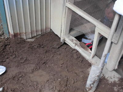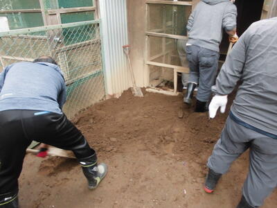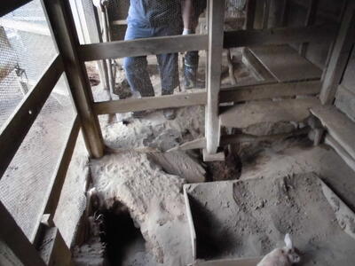 ( ↓ ウサギが掘った穴をうめたり、不安定になった柱を固定したりします。)