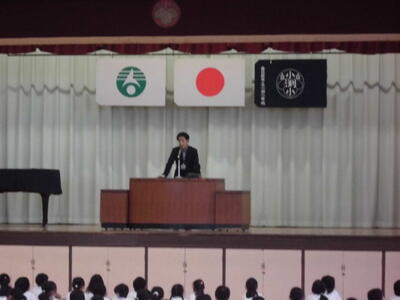 ↑ 校長先生からは、運動会での各学年の頑張りや、自分自身の鉄棒の体験をふまえて、自分の限界まで頑張る、というお話がありました。