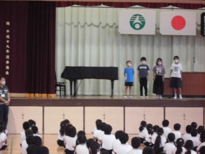 ↑ 今月の生活目標は『自分から先にあいさつをし、返事ははっきりとします』です。三年生の先生と子供たちによる、今月の生活目標の確認がありました。三年生代表の子供たちがあいさつについて、実演して見せてくれました。