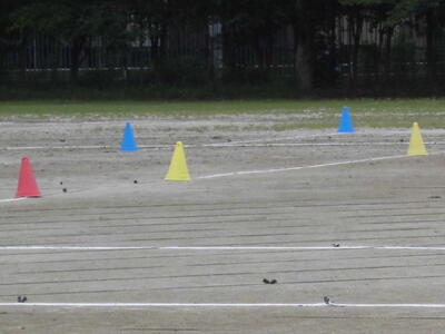 ( ↓ 早朝から先生たちで校庭の整備をおこないました。ラインを引いてコーンを並べてコースを作ったり、石拾いや除草をしたりしました。)
