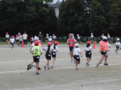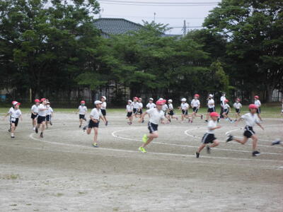 ( ↓ 多くの児童が校庭に出ました。マラソンや8秒間走に取り組んでいます。)