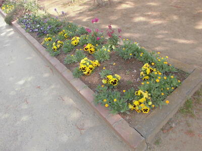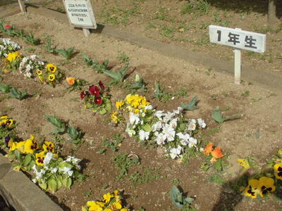 今日は日曜日で学校はお休みです。学校の花壇の花もきれいに咲いています。