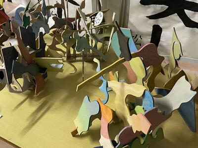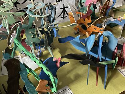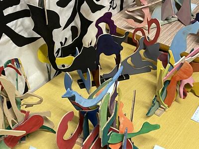 保護者の方や地域の方に来校いただく機会ができませんので、このホームページ内でも学校内の様子をお伝えします。(今回は、5年生の廊下の図工の作品です。木をいろいろな形に直線や曲線で切って組み合わせ、それぞれが個性のあるオリジナルの作品を作り上げています。)