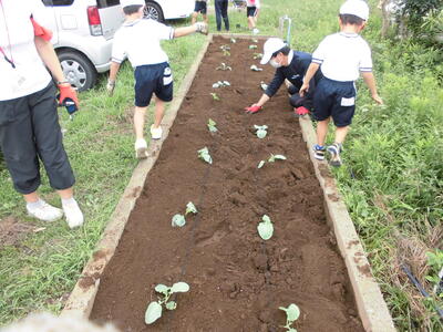 たんぽぽ・ひまわり学級の苗植え 投稿日時 : 2020/09/14 編集長 カテゴリ: 今日は学校の農園に、たんぽぽ・ひまわり学級の子供他たちが、ブロッコリーの苗を植えました。校長先生に教わりながら、ていねいに苗を置いたり、土をかぶせたりしていきました。最後に、自分たちが苗を植えた畑を眺めて、ブロッコリーが元気に育ってくれることを願って、教室に戻りました。