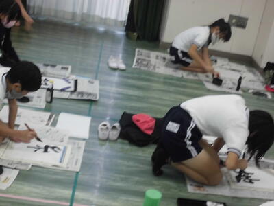 5時間目の6年生の書写の時間です。習字で『緑の大地』の文字を書きます。