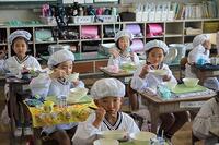 学校栄養士の先生に、グリンピースの話を聞き、2年生がさやむきをしました。