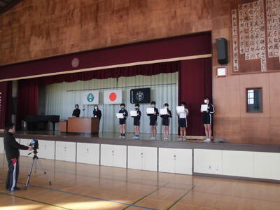 ( ↓ 賞状を受け取る場面は、各教室のモニターにリモートで流されます。)