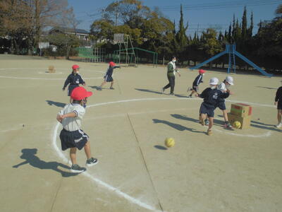 ( ↓ 1年生の体育の授業。サッカーに取り組んでいます。守備側の守るゴールのダンボ-ル箱をめがけて攻撃側がかかんにシュートしています。)