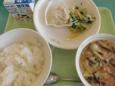 10日の給食は、吹き寄せごはん、牛乳、卵焼き、春菊のごま和え、沢煮椀、でした。